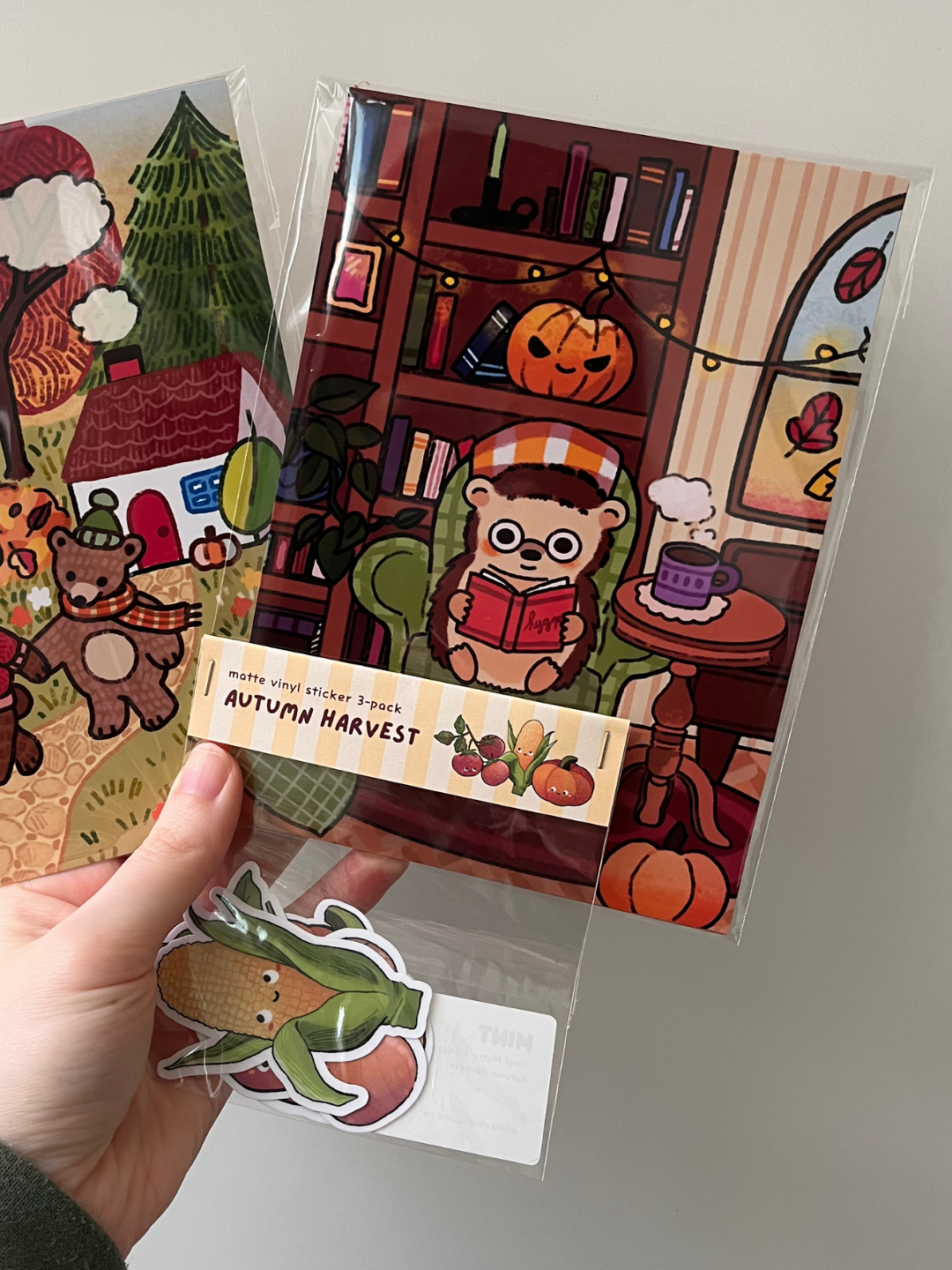 A cozy illustration of a hedgehog in his library, enjoying the autumn hygge 🦔